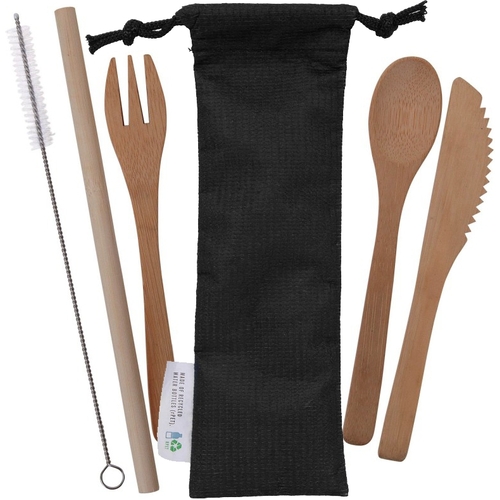An eco-friendly utensil set in a bag made of recycled water bottles (RPET)