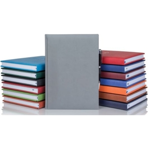 Present a professional note-taker during your next promotional event! Measuring 7" x 9 11/16", this handy journal features our most popular cover, which contains a smooth soft texture often mistaken for leather. It also includes 256 pages printed in modern gray, two ribbon markers in blue and silver, an elastic black pen loop and our standard size stock silver pen inserted. Choose from the selection of bold cover color options and customize each journal with a company name, logo or marketing message. What an excellent opportunity to promote you brand! Material - Polyrethane.