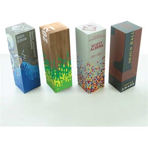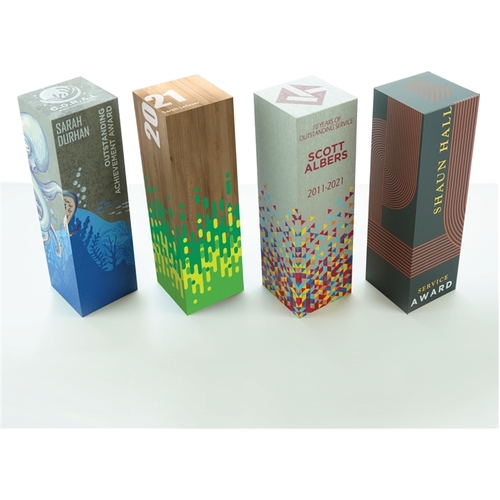 Visions’ Elements 360 Collection is a solid wood award with a full color digital print on a “finished” background that serves as a backdrop to custom imagery. This award allows for full color imagery and messaging on all sides of the award, even the top, with your choice of 4 finishes (Stone, Oak, Aluminum and Black) to enhance your design.